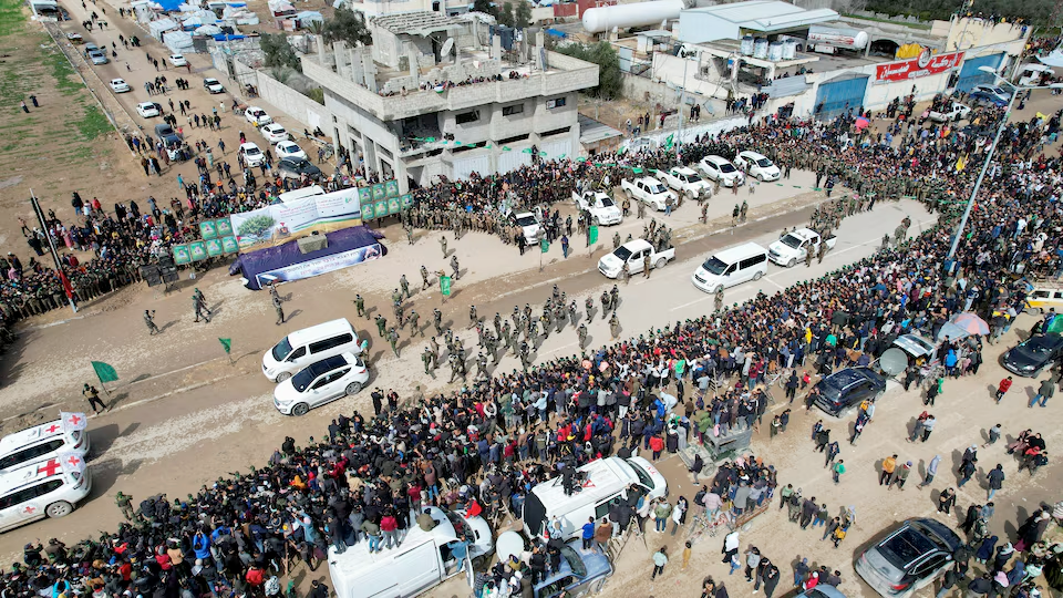 صورة التقطتها طائرة مسيرة تظهر فلسطينيين ومسلحي حماس خلال عملية إطلاق سراح رهائن في وسط قطاع غزة يوم 22 فبراير 2025 - رويترز