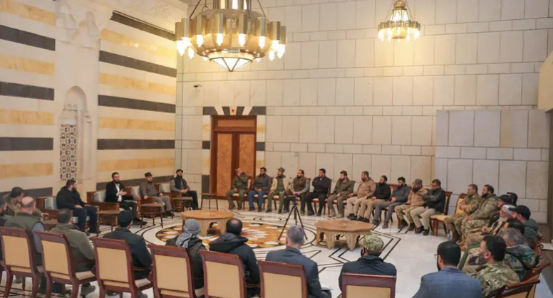 وفي وقت سابق أكد الشرع، أنه سيتم حل كل الفصائل، ولن يكون هناك سلاح إلا بأيدي الدولة السورية. وأضاف أنه لن يكون هناك تجنيد إجباري في سوريا بعد الآن.