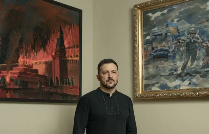 وذكرت “تايم” في المقالة أن هناك صورة لسفينة روسية تغرق في البحر الأسود عام 2022 معلقة فوق سرير زيلينسكي.