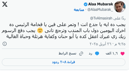 وقال علاء في تدوينة على صفحته بمنصة إكس (تويتر سابقا): “يجب ده ايه يا جدع انت ! وتمر على فين يا فخامة الرئيس ده اخرك اليومين دول باب المندب وترجع تاني.. يجب دفع الرسوم زيك زي غيرك اعقل كده يا أبو حنان وكفاية هرتلة وحباة الغالية”.