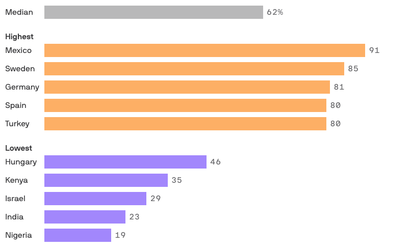 📉 وبينما تراجعت شعبية الرئيس جو بايدن بشكل ملحوظ خلال ولايته، إلا أن الثقة به لا تزال أعلى من ترامب في غالبية البلدان.