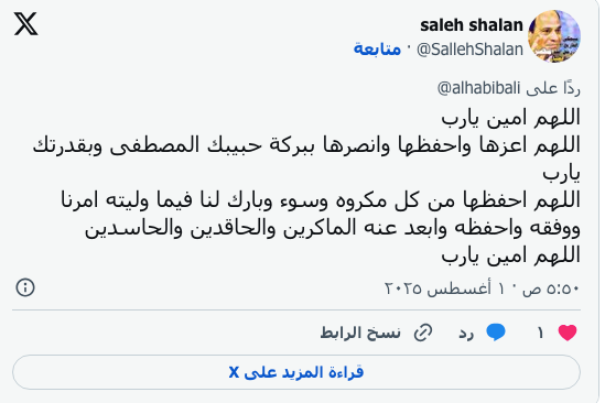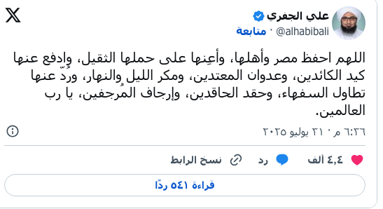 وقال الجفري في تدوينة على منصة “إكس”: “اللهم احفظ مصر وأهلها، وأعِنها على حملها الثقيل، وادفع عنها كيد الكائدين، وعدوان المعتدين، ومكر الليل والنهار، وردّ عنها تطاول السفهاء، وحقد الحاقدين، وإرجاف المُرجفين، يا رب العالمين”.